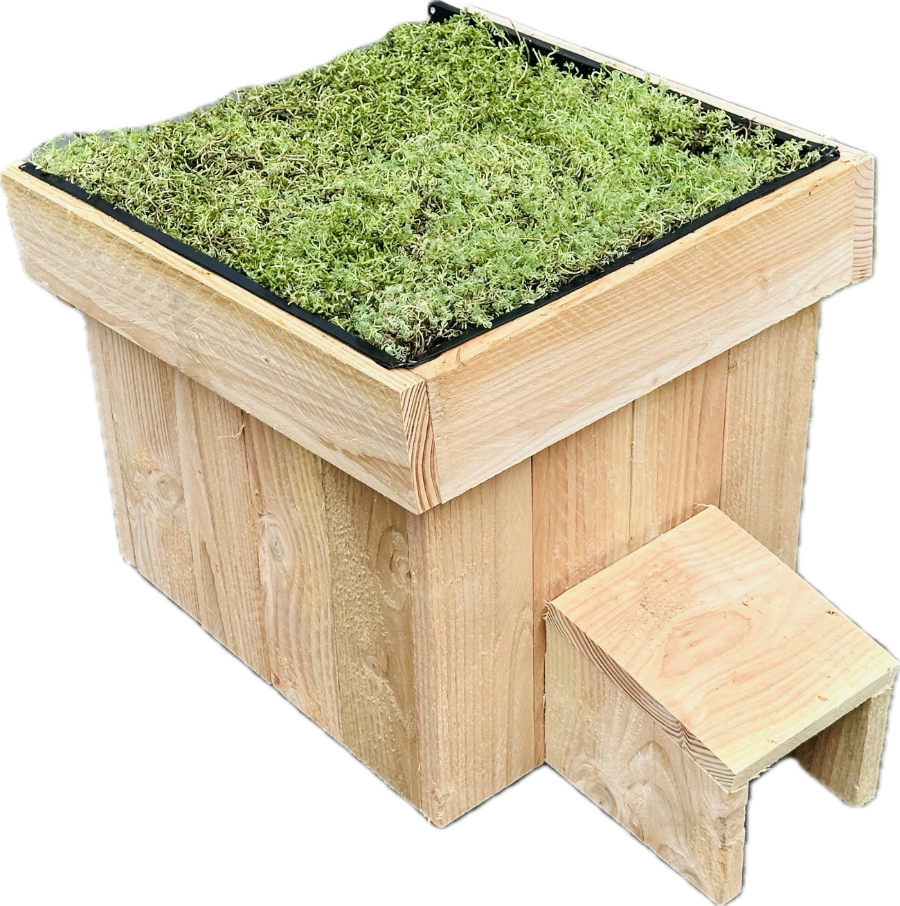 Plaats het egelhuis op een rustige, beschutte plek, zoals onder een struik, haag of boompje. Dit beschermt egels tegen wind, regen en direct zonlicht. Het groendak zorgt voor natuurlijke isolatie en helpt de temperatuur te reguleren. - Droge ondergrond